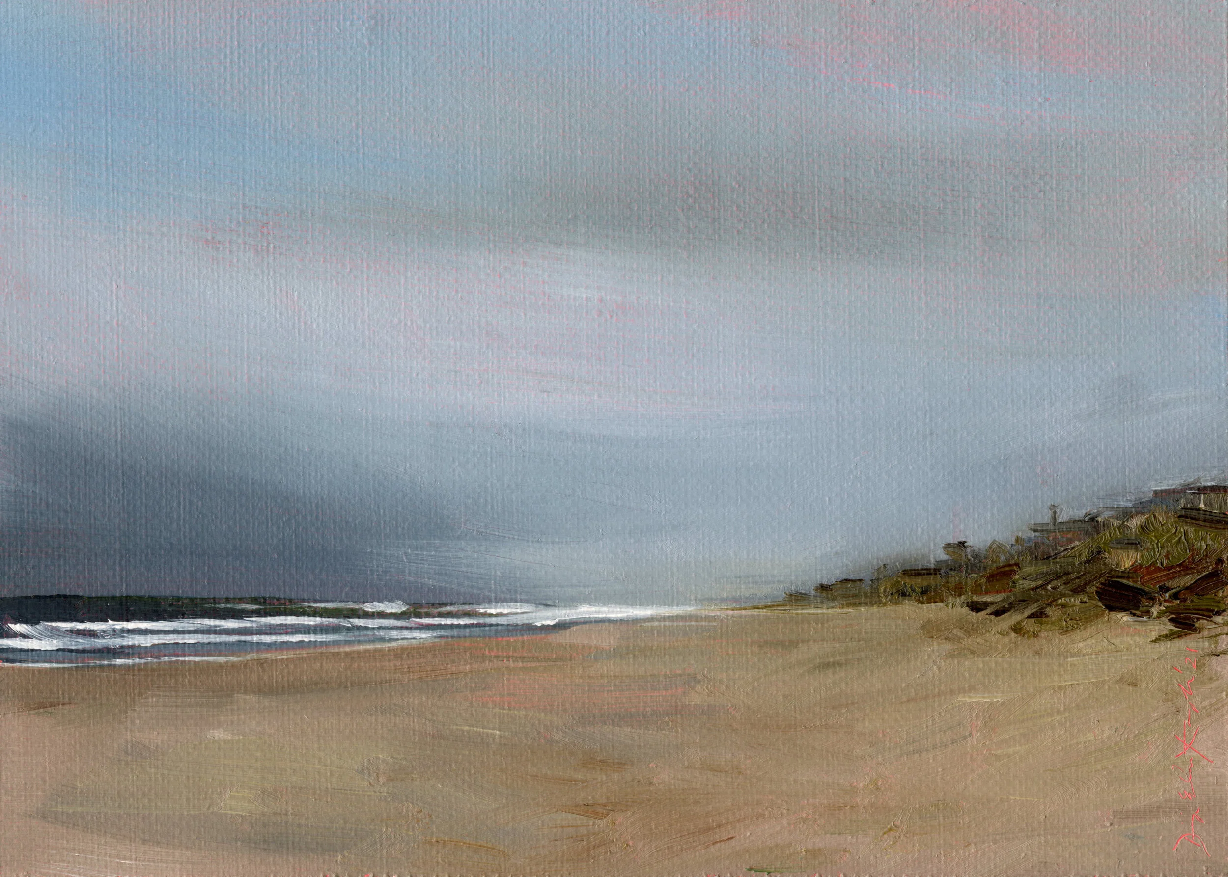 It’s a cool morning on the beach. The sand is wet and cold and hard under my bare feet. I hear seagulls and pelicans call and dive into the serene water which seems to blend into the sky at the horizon.